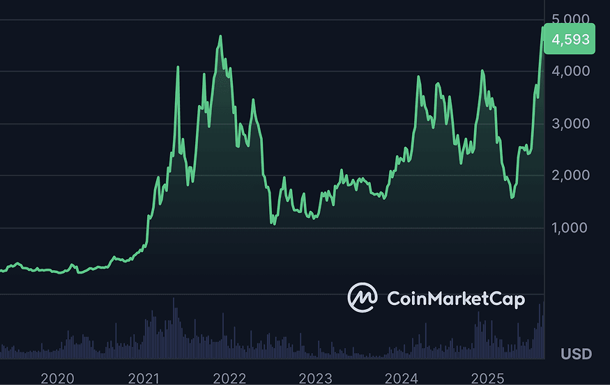 Forecasting Ethereum’s price requires a careful examination of both historical trends and current market conditions. The previous all-time high was followed by a deep correction, similar to Bitcoin’s cycles. Today, Bitcoin has already doubled its past peak, proving that strong assets can return with even greater force. Ethereum may follow a similar path, but realistic expectations are essential. See the current ETH chart from CoinMarketCap below ▼