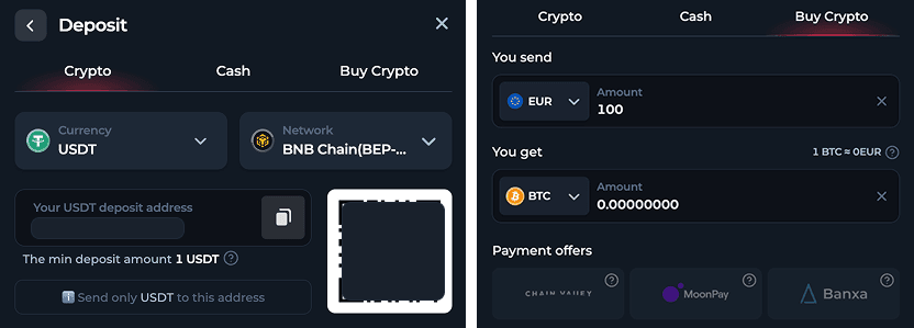 You can deposit any currency on BetFury in a few clicks. First, you can send crypto from your wallet by specifying an address and a supported network (ERC-20, BSC, etc.). Second, you can buy crypto directly on the platform via Visa, MasterCard, or Apple Pay. Moreover, we provide an opportunity to swap crypto. It allows you to swap your tokens to those you need more.